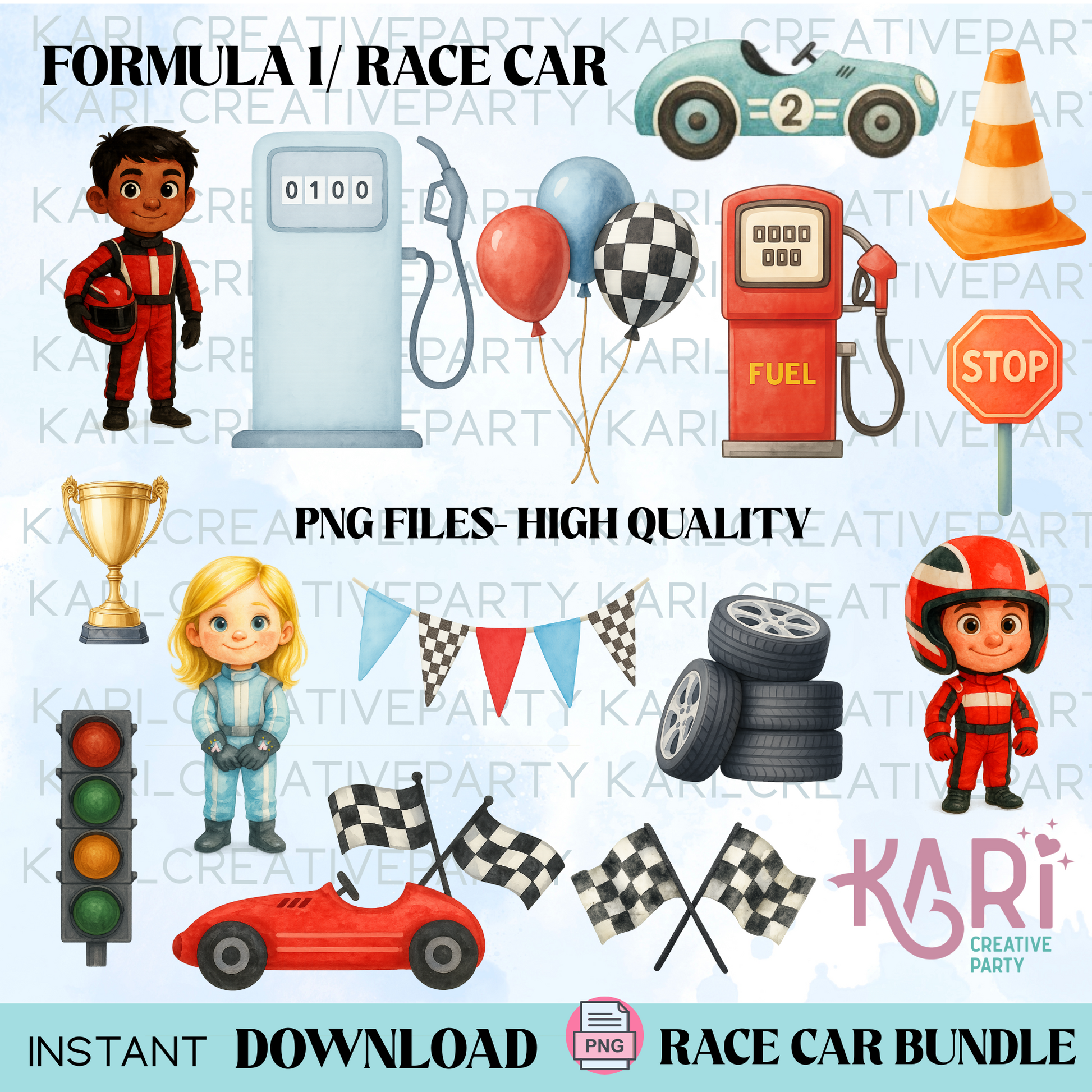 Bring your race-themed party to life and cross the finish line in style with this watercolor Formula 1 clipart set!