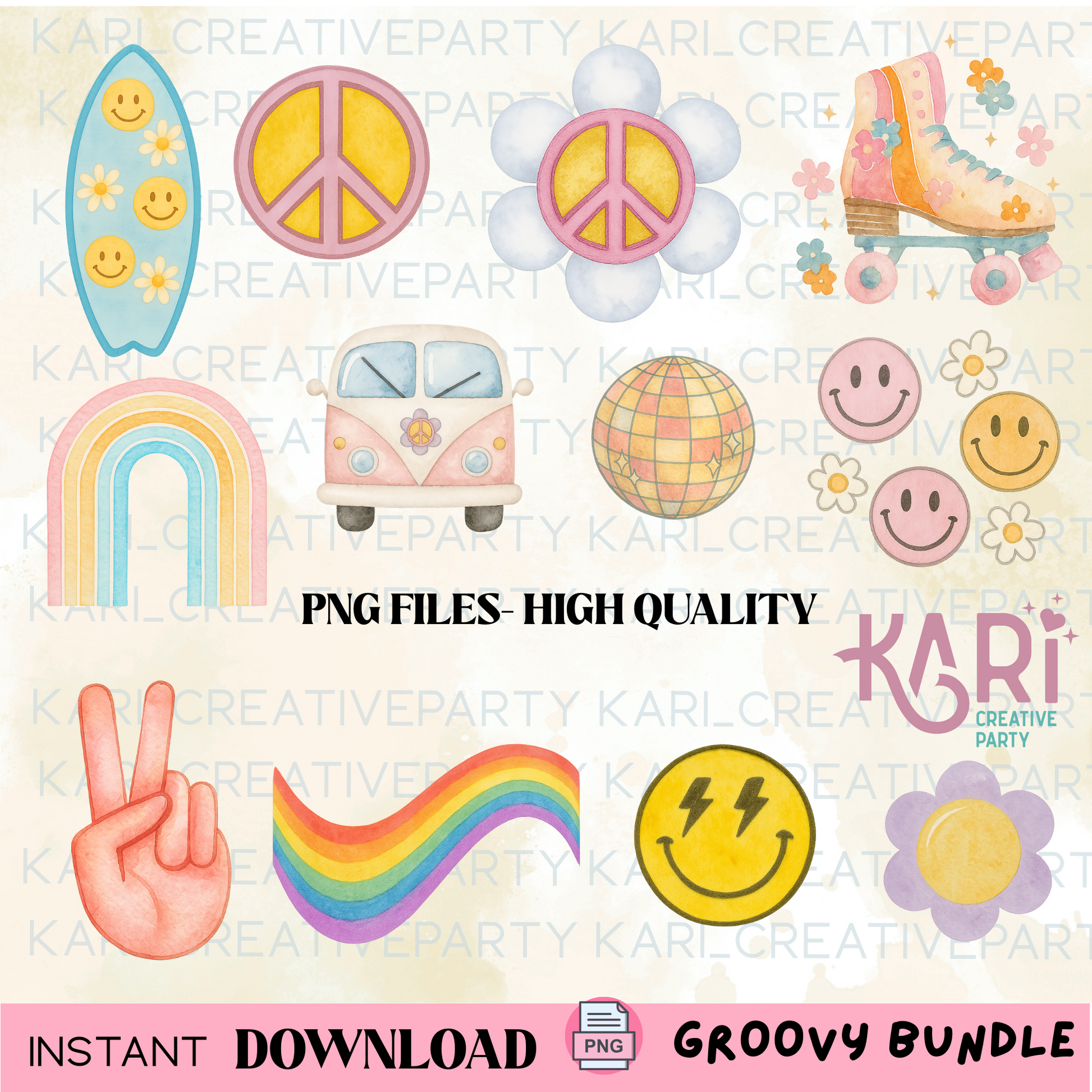 This high-quality PNG collection is perfect for creative crafters who love retro 70s aesthetics, pastel tones, and playful designs. You'll get a mix of peace signs, roller skates, rainbows, disco balls, and more β all in a soft watercolor style.